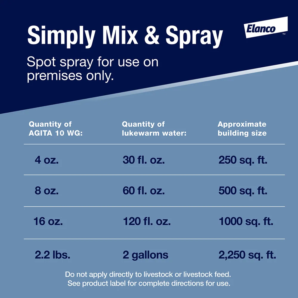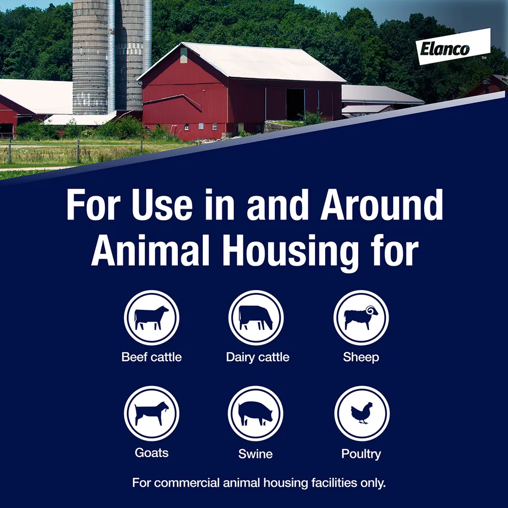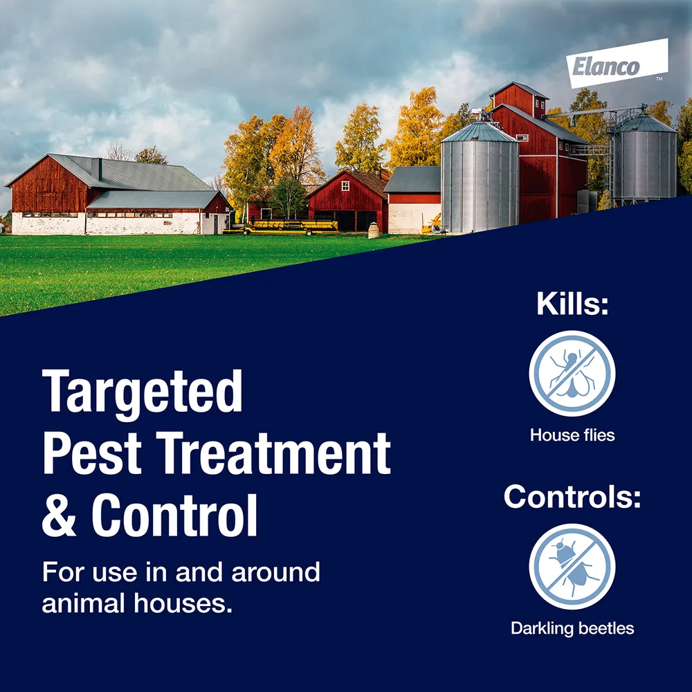 Directions: Use as part of an integrated pest management program for house flies. For application as a spot spray insecticidal bait. Use suspension on day of mixing, preferably immediately after preparation. Mix quantity indicated on label in corresponding volume of lukewarm water. Apply using standard liquid spray applicator to approximately 1/3 of total intended surface area to be treated, stirring occasionally. Surfaces on which flies are particularly likely to settle should be sprayed. Re-agitate before use if spraying is interrupted for longer than 30 minutes. See label for additional information and for instructions for litter beetle control in broiler houses. Apply only in locations not accessible to children, pets, domestic animals or wildlife. Protect from direct sunlight, water and rainfall. Do not apply directly to livestock or livestock feed. For commercial animal housing facilities only. Do not allow product to contact plants in bloom if bees are foraging in treatment area.