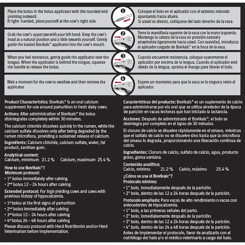 Bovikalc calcium bolus for cows provides both fast and long-lasting serum calcium levels in freshening cows. Unique bolus formulation offers two sources of calcium – calcium chloride for rapidly available bloodserum calcium levels (within 30 minutes), and calcium sulfate for sustained calcium levels over time.