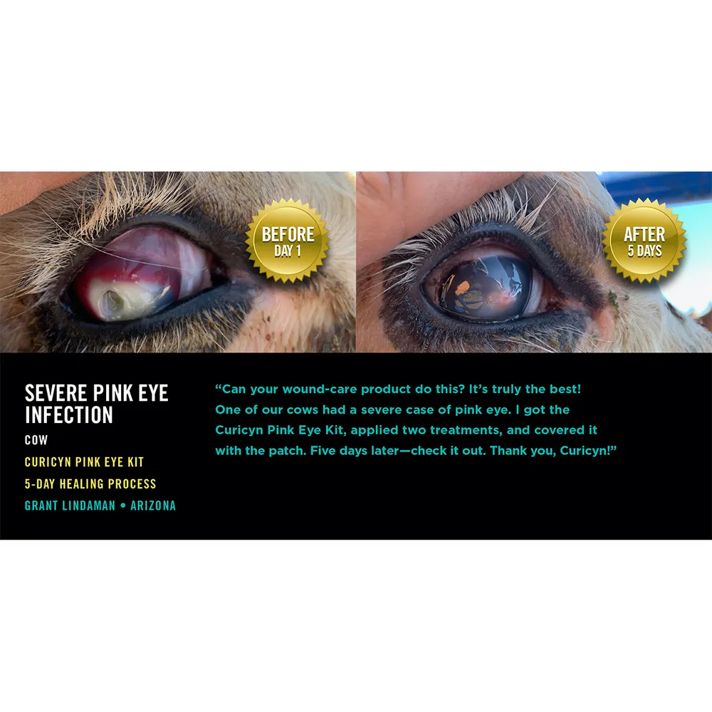 Provides all the necessary products needed to help alleviate animal’s pink eye symptoms. For use in horses, cattle, sheep, goats and swine. Fast-acting formula helps promote healing in 1-3 days. pH balanced. Includes 3 oz bottle of solution, 5 biodegradable eye patches and 5 oz tube of adhesive.