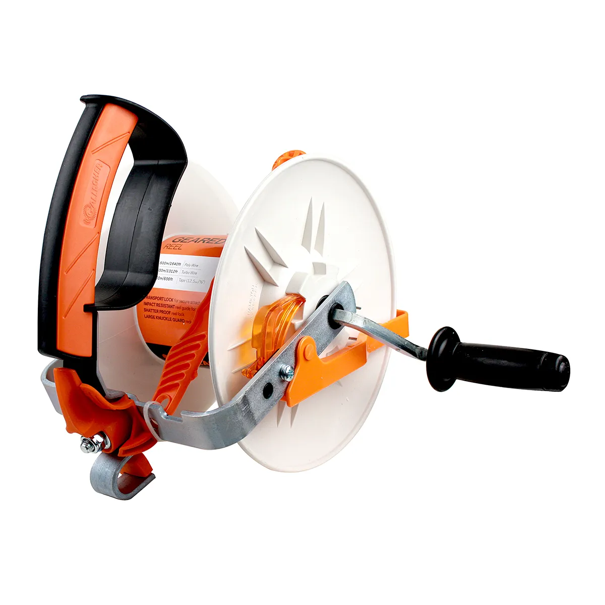 Carrying handle with knuckle guard to protect hands. Long crank arm for better leverage. Wire loop for connecting power to wire/tape.