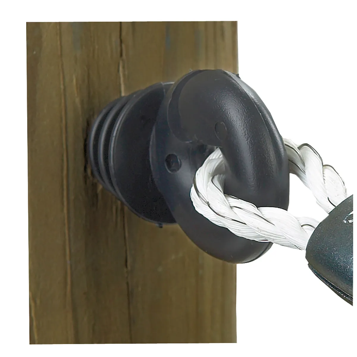 For use with line or corner wood posts. Holds rope up to 8 mm, 1/2″ tape and wire. Black.