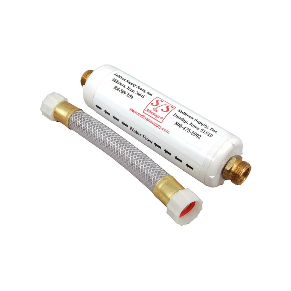 Features plastic filter body, heavy-duty brass fitting and nylon hose connector. Easily screws onto faucet.